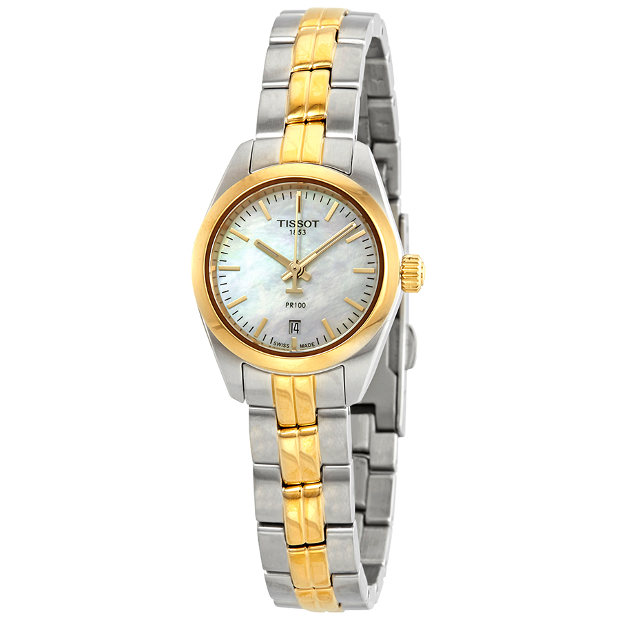 Stainless steel case with a two-tone (silver-tone and yellow gold PVD) stainless steel bracelet. Fixed yellow gold PVD bezel. White mother of pearl dial with luminous yellow gold-tone hands and index hour markers. Minute markers around the outer rim. Dial Type: Analog. Luminescent hands. Date display at the 6 o'clock position. ETA caliber F03.111 quartz movement. Scratch resistant sapphire crystal. Pull / push crown. Solid case back. Round case shape. Case size: 25 mm. Case thickness: 6.9 mm. Band width: 12 mm. Fold over clasp. Water resistant at 100 meters / 330 feet. Functions: date, hour, minute, second, battery eol indicator. Casual watch style. Watch label: Swiss Made. Tissot PR 100 White Mother of Pearl Dial Two-tone Ladies Watch T1010102211100.