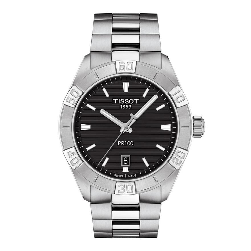 316L stainless steel case with a stainless steel bracelet. Fixed stainless steel bezel. Black dial with silver-tone hands and index hour markers. Minute markers around the outer rim. Dial Type: Analog. Luminescent hands and markers. Date display at the 6 o'clock position. ETA caliber F06.115 quartz movement. Scratch resistant sapphire crystal. Pull / push crown. Solid case back. Round case shape. Case size: 42 mm. Case thickness: 9.4 mm. Band width: 22 mm. Fold over clasp with a safety release. Water resistant at 100 meters / 330 feet. Functions: date, hour, minute, second, battery eol indicator. Pr100 Series. Casual watch style. Watch label: Swiss Made. Tissot PR100 Quartz Black Dial Mens Watch T101.610.11.051.00.