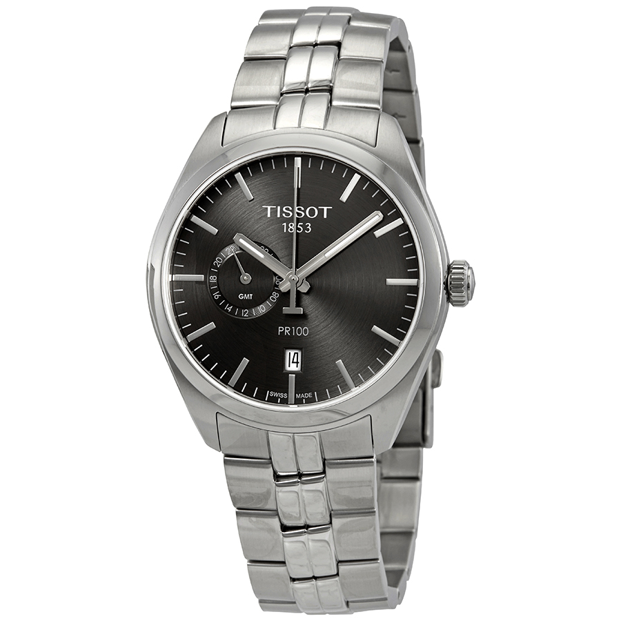 Silver-tone stainless steel case with a silver-tone stainless steel bracelet. Fixed silver-tone stainless steel bezel. Black dial with luminous silver-tone hands and index hour markers. Minute markers around the outer rim. Dial Type: Analog. Luminescent hands. Date display above the 6 o'clock position. One subdial displaying: 24 hour. ETA Caliber F06.811 quartz movement. Scratch resistant sapphire crystal. Pull / push crown. Solid case back. Round case shape, case size: 39 mm, case thickness: 10.1 mm. Band width: 20 mm. Fold over with push button release clasp. Water resistant at 100 meters / 330 feet. Functions: date, GMT, second time zone, hour, minute, second. Pr100 Series. Casual watch style. Watch label: Swiss Made. Tissot PR100 Black Dial Mens Watch T101.452.11.061.00.