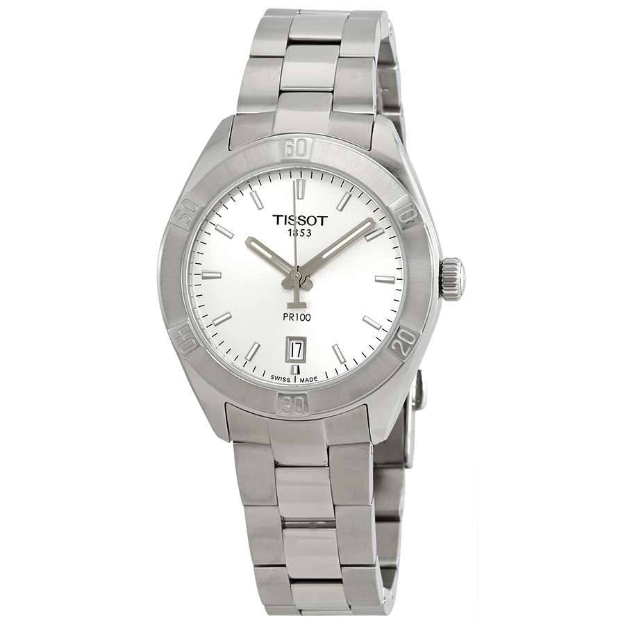 Stainless steel case with a stainless steel bracelet. Fixed stainless steel bezel. Silver dial with luminous silver-tone hands and index hour markers. Minute markers around the outer rim. Dial Type: Analog. Luminescent hands and markers. Date display at the 3 o'clock position. ETA caliber 955.412 quartz movement. Scratch resistant sapphire crystal. Pull / push crown. Solid case back. Round case shape. Case size: 36 mm. Case thickness: 9 mm. Band width: 18 mm. Fold over clasp with a push button release. Water esistant at 100 meters / 330 feet. Functions: date, hour, minute, second, battery eol indicator. Casual watch style. Watch label: Swiss Made. Tissot PR100 Silver Dial Stainless Steel Ladies Watch T101.910.11.031.00.