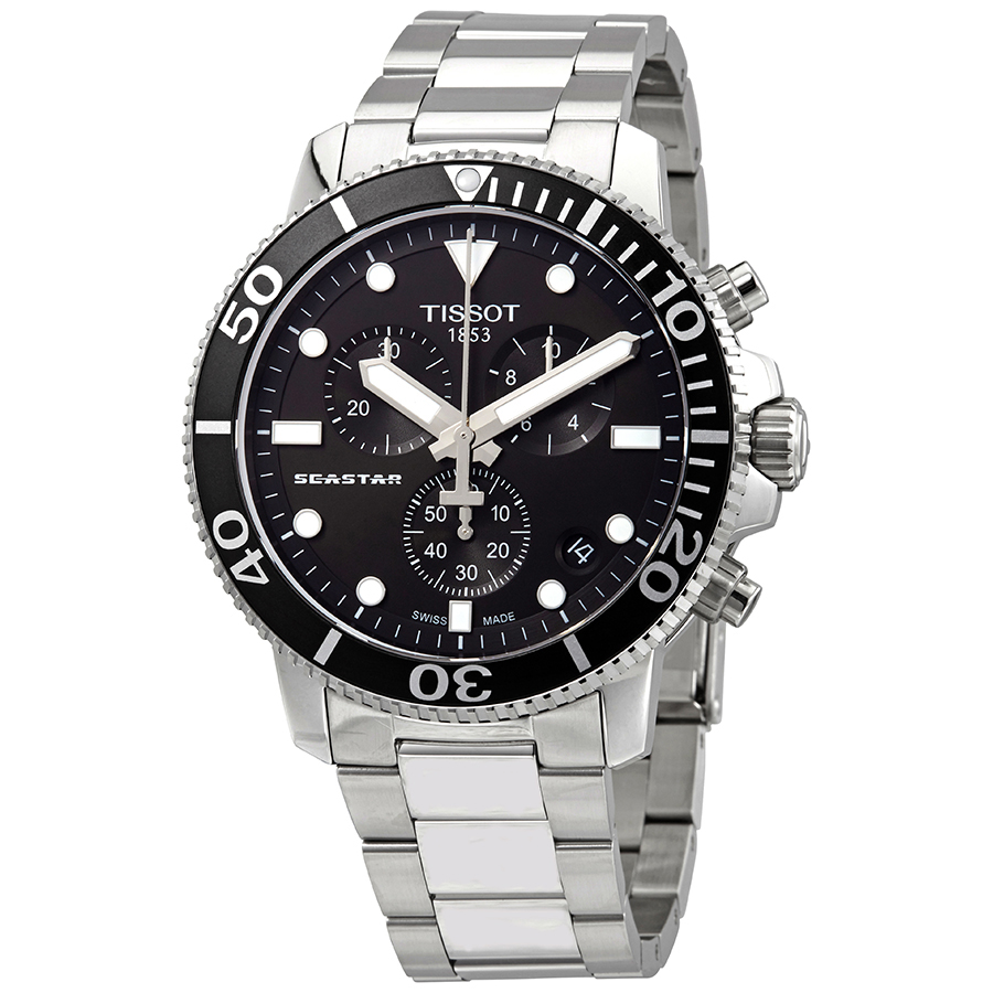 Stainless steel case with a stainless steel bracelet. Uni-directional rotating stainless steel bezel with a black aluminium inlay. Black dial with luminous silver-tone hands and dot hour markers. Minute markers around the outer rim. Dial Type: Analog. Luminescent hands and markers. Date display between the 4 and 5 o'clock positions. Chronograph - three sub-dials displaying: 60 second, 30 minute and 1/10th of a second. ETA caliber G10.212 quartz movement. Scratch resistant sapphire crystal. Screw down crown. Solid case back. Round case shape. Case size: 45.5 mm. Case thickness: 12.8 mm. Band width: 22 mm. Fold over clasp with a safety release. Water resistant at 300 meters / 1000 feet. Functions: chronograph, rattrapante, date, hour, minute, small second. Dive watch style. Watch label: Swiss Made. Tissot Seastar 1000 Chronograph Quartz Mens Watch T1204171105100.