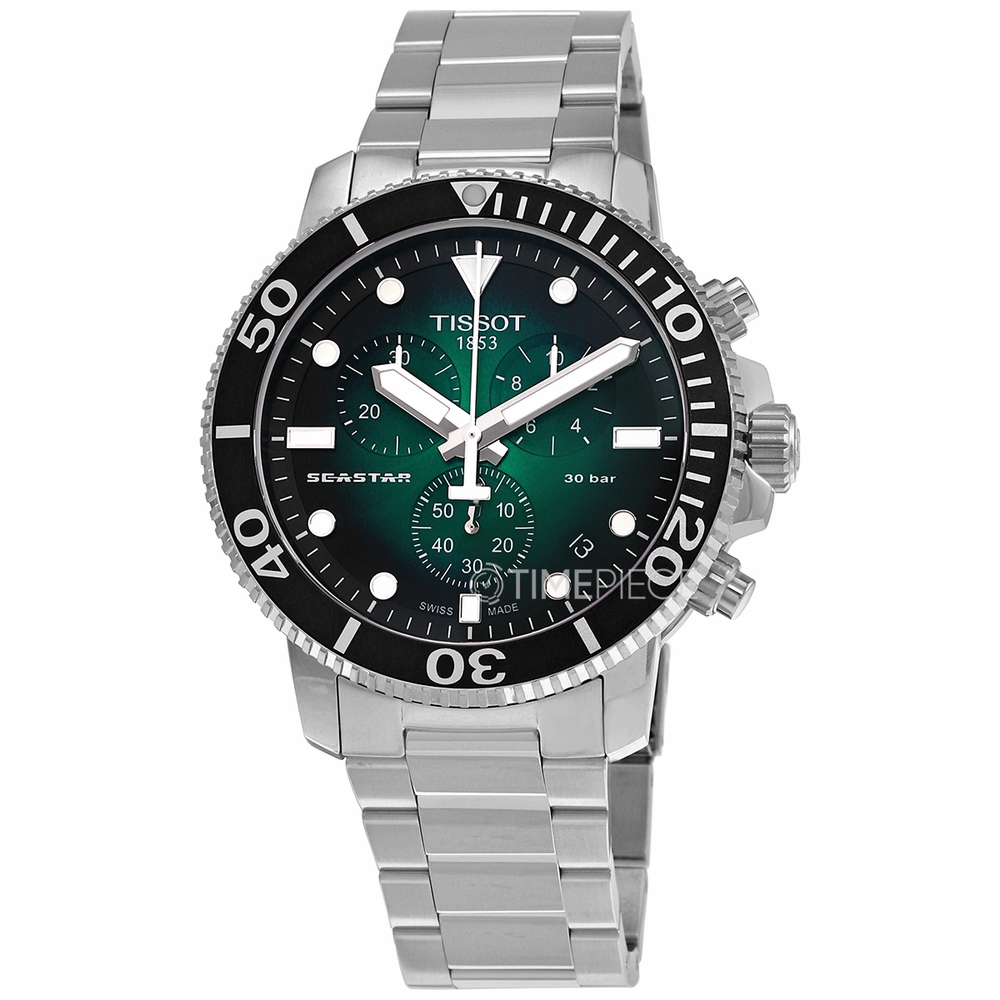 Stainless steel case with a stainless steel bracelet. Uni-directional rotating stainless steel bezel with an inlaid black aluminium ring. Green dial with luminous silver-tone hands and dot hour markers. Index markers appear at the 3, 6, 9 and 12 o'clock positions. Minute markers around the outer rim. Dial Type: Analog. Luminescent hands and markers. Date display between the 4 and 5 o'clock positions. Chronograph - three sub-dials displaying: 12 hours, 30 minutes and 60 seconds. ETA caliber G10.212 quartz movement. Scratch resistant sapphire crystal. Pull / push crown. Solid case back. Round case shape. Case size: 45 mm. Case thickness: 12.8 mm. Band width: 22 mm. Fold over clasp. Water resistant at 300 meters / 1000 feet. Functions: chronograph, date, hour, minute, second. Seastar Series. Casual watch style. Watch label: Swiss Made. Tissot Seastar Chronograph Quartz Green Dial Mens Watch T120.417.11.091.01.