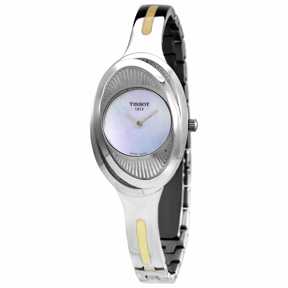 Silver-tone stainless steel case and bracelet. Fixed bezel. Blue mother of pearl dial with silver-tone hands. No markers. Dial Type: Analog. Quartz movement. Scratch resistant sapphire crystal. Pull / push crown. Solid case back. Unique case shape, case size: 33 mm. Jewelry clasp. Water resistant at 30 meters / 100 feet. Functions: hour, minute. T-lady Series. Dress watch style. Watch label: Swiss Made. Item Variations: T0290091105700. Tissot T-Lady Flower Quartz Blue Mother of Pearl Dial Ladies Watch T03.1.085.80.