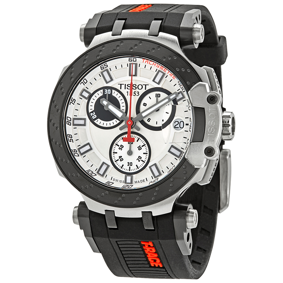 Black PVD stainless steel case with a black silicone strap. Fixed stainless steel bezel with a black PVD ring. White dial with luminous black hands and index hour markers. Minute markers. Tachymeter markings around the outer rim. Dial Type: Analog. Luminescent hands and markers. Date display at the 3 o'clock position. Chronograph - three sub-dials displaying: 60 second, 60 minute and 1/10th of a second. ETA caliber G10.212 quartz movement. Scratch resistant sapphire crystal. Solid case back. Round case shape. Case size: 47.6 mm. Case thickness: 12.25 mm. Band width: 22 mm. Tang clasp. Water resistant at 100 meters / 330 feet. Functions: chronograph, date, hour, minute, second. Sport watch style. Watch label: Swiss Made. Tissot T-Race Chronograph Quartz White Dial Mens Watch T115.417.27.011.00.