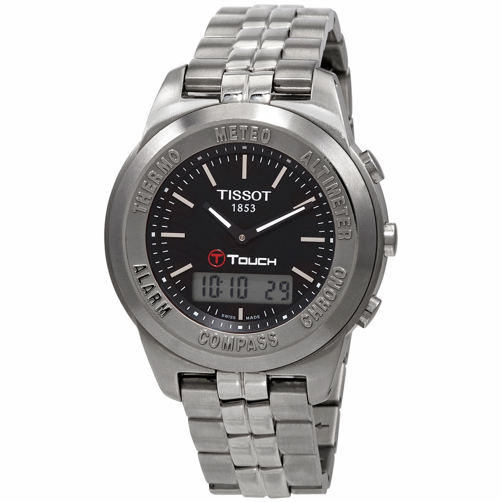 Silver-tone stainless steel case and bracelet. Black dial with silver-tone hands and index hour markers. Minute markers around the outer rim. Dial Type: Analog-digital. Quartz movement. Scratch resistant sapphire crystal. Pull / push crown. Solid case back. Round case shape, case size: 42 mm. Fold over clasp with a safety release. Water resistant at 30 meters / 100 feet. Functions: hour, minute, second, chronograph, compass, alarm, thermo, meteo. T-touch Series. Sport watch style. Watch label: Swiss Made. Tissot T-Touch Quartz Analog-Digital Black Dial Mens Watch T33.1.388.51.