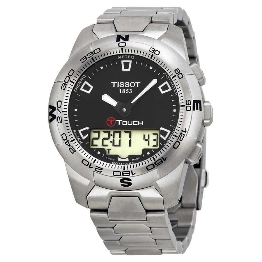 The beautiful Tissot T0474201105100 watch features a stainless steel 42.7mm case, with a bi-directional rotating bezel, and a black (t touch) dial covered by a tactile sapphire crystal. The stylish wristwatch is equipped with an exclusive 20mm stainless steel which combines comfort and sturdiness. This horological trendy device has perpetual calendar, chronograph, world time, alarm, date, day, GMT, second time zone, hour, minute, second, battery eol indicator, thermometer, altitude indicator, compass functions.