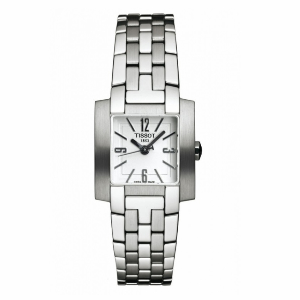 Silver-tone stainless steel case and bracelet. Fixed bezel. White dial with silver-tone hands and index-Arabic numeral hour markers. Arabic numeral markers at the 3, 6, 9 and 12 o'clock positions. Dial Type: Analog. Quartz movement. Scratch resistant sapphire crystal. Pull / push crown. Transparent see through case back. Square case shape, case size: 22 mm x 20 mm, case thickness: 7 mm. Band width: 15 mm, band length: 6.5 inches. Fold over clasp with a safety release. Water resistant at 30 meters / 100 feet. Functions: hour, minute, second. T-trend/txs Series. Dress watch style. Watch label: Swiss Made. Tissot T-Trend/TXS Quartz White Dial Ladies Watch T60.1.282.32.