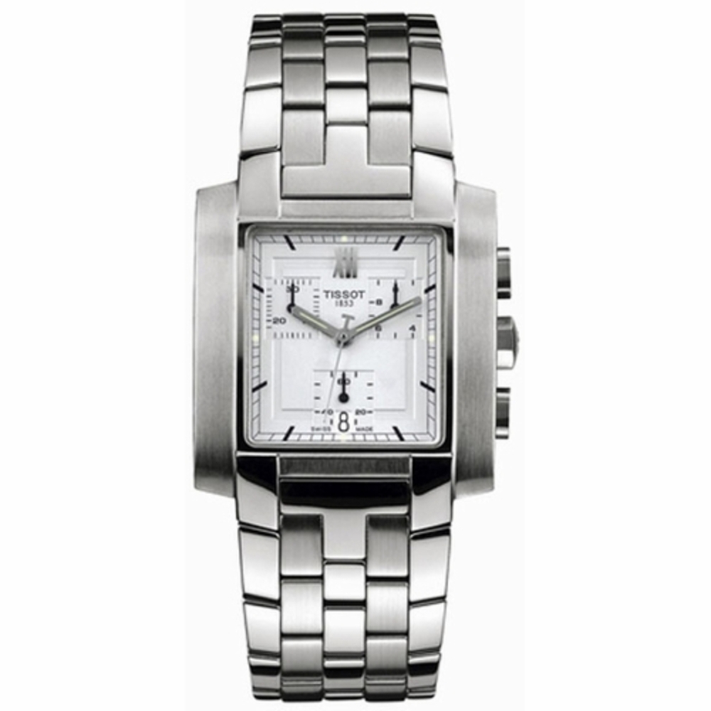 Stainless steel case with a stainless steel bracelet. Fixed stainless steel bezel. White dial with luminous silver-tone hands and index hour markers. A Roman numeral appears at the 12 o'clock position. Minute markers around the outer rim. Dial Type: Analog. Luminescent hands. Date display at the 6 o'clock position. Chronograph - three sub-dials displaying: 60 second, 30 minute and 1/10th of a second. Quartz movement. Scratch resistant sapphire crystal. Pull / push crown. Solid case back. Rectangle case shape. Case size: 33 mm. Case thickness: 10 mm. Band width: 24 mm. Deployment clasp. Water resistant at 30 meters / 100 feet. Functions: chronograph, date, hour, minute, second. T-trend Txl Series. Casual watch style. Watch label: Swiss made. Item Variations: T60158733. Tissot TXL Chronograph Whiute Dial Mens Watch T60.1.587.33.