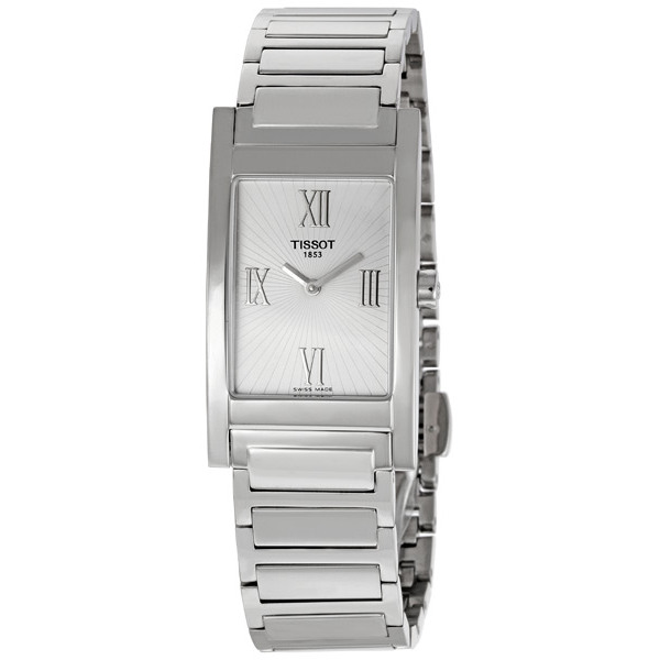 Stainless steel case with a stainless steel link bracelet. Fixed stainless steel bezel. Silver dial with silver-tone hands. Roman numerals appear at the 3, 6, 9 and 12 o'clock positions. Quartz movement. Scratch resistant sapphire crystal. Steel crown. Solid case back. Case diameter: 23 mm. Case thickness: 7 mm. Deployment clasp. Water resistant at 30 meters/ 100 feet. Functions: hours, minutes. Tissot T Trend Happy Chic Mens Watch T0163091103300.