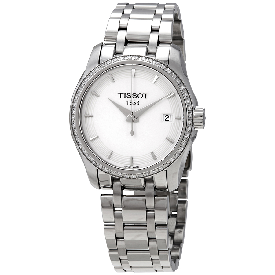 Stainless steel case with a stainless steel bracelet. Fixed stainless steel bezel set with diamonds. White dial with silver-tone hands and index hour markers. Dial Type: Analog. Date display at the 3 o'clock position. ETA caliber F05.111 quartz movement. Scratch resistant sapphire crystal. Pull / push crown. Solid case back. Round case shape. Case size: 32 mm. Case thickness: 8 mm. Band width: 17 mm. Fold over clasp with a push button release. Water resistant at 100 meters / 330 feet. Functions: date, hour, minute, second. T-trend Couturier Series. Dress watch style. Watch label: Swiss Made. Item Variations: T035 210 61 011 00, T035-210-61-011-00, T035/210/61/011/00, T0352106101100. Tissot T-Trend Couturier White Dial Diamond Ladies Watch T035.210.61.011.00.