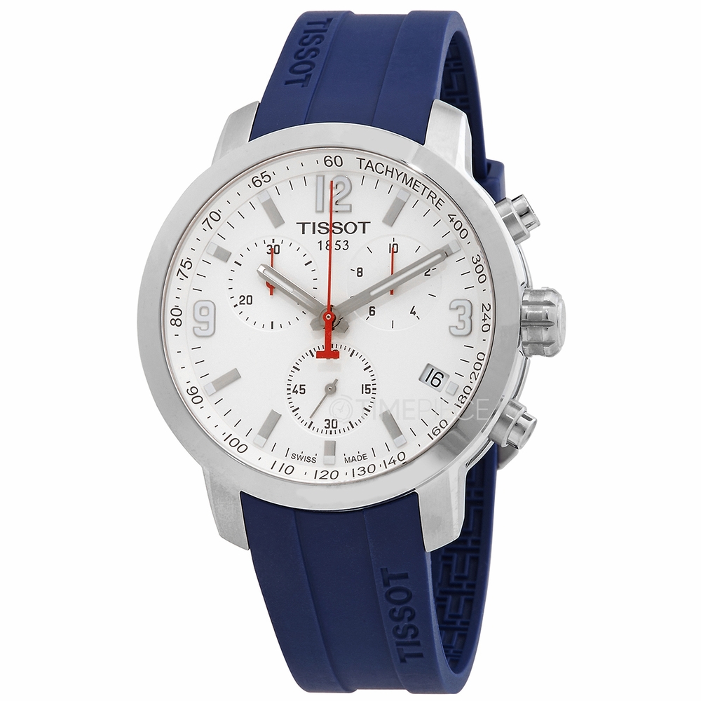 Silver-tone stainless steel case with a blue rubber strap. Fixed silver-tone bezel. Silver-tone dial with silver-tone hands and index hour markers. Minute markers around the outer rim. Dial Type: Analog. Luminescent hands and markers. Date display at the 4 o'clock position. Chronograph - three sub-dials displaying: 60 second, 30 minute and 10 hour. ETA Caliber G10.211 quartz movement. Scratch resistant sapphire crystal. Case size: 42 mm. Round case shape. Buckle clasp. Water resistant at 200 meters / 660 feet. Functions: chronograph, rattrapante, date, hour, minute, small second. Sport watch style. Watch label: Swiss Made. Tissot PRC 200 Chronograph Mens Watch T055.417.17.017.01.