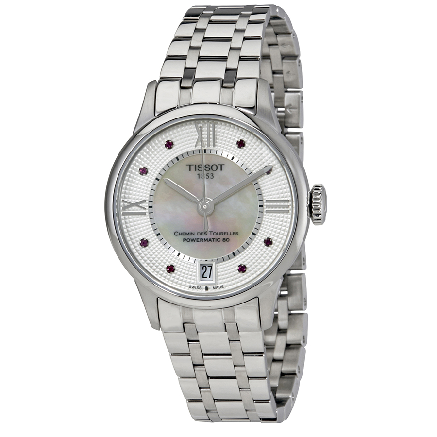 Silver-tone stainless steel case with a silver-tone stainless steel bracelet. Fixed silver-tone stainless steel bezel. White mother of pearl dial with silver-tone sword-shaped hands and red ruby hour markers. Roman numerals mark the 3, 9 and 12 o'clock positions. minute markers around an inner ring. Dial Type: Analog. Date display at the 6 o'clock position. Powermatic 80.111 Automatic movement, containing 23 Jewels, bitting at 28800 vph, and has a power reserve of approximately 80 hours. Scratch resistant sapphire crystal. Pull / push crown. Transparent case back. Round case shape, case size: 32 mm, case thickness: 10.7 mm. Band width: 16 mm. Fold over with push button release clasp. Water resistant at 50 meters / 165 feet. Functions: date, hour, minute, second. Dress watch style. Watch label: Swiss Made. Tissot Chemin Des Tourelles White Mother of Pearl Rubies Dial Ladies Watch T099.207.11.113.00.