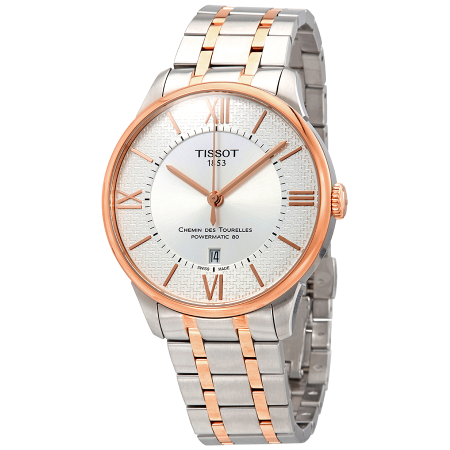 Silver-tone stainless steel case with a two-tone (silver-tone and rose gold PVD) stainless steel bracelet. Fixed rose gold PVD stainless steel bezel. Silver dial with rose gold-tone alpha-style shape hands and index hour markers. Roman numerals mark the 3, 6, 9 and 12 o'clock positions. minute markers around an inner ring. Dial Type: Analog. Date display above the 6 o'clock position. Tissot Calibre Powermatic 80.111 automatic movement with an 80-hour power reserve. Scratch resistant sapphire crystal. Pull / push crown. Solid case back. Round case shape, case size: 42 mm, case thickness: 11.2 mm. Band width: 21 mm. Butterfly clasp. Water resistant at 50 meters / 165 feet. Functions: date, hour, minute, second. Casual watch style. Watch label: Swiss Made. Tissot Chemin des Tourelles Automatic Mens Watch T099.407.22.038.01.