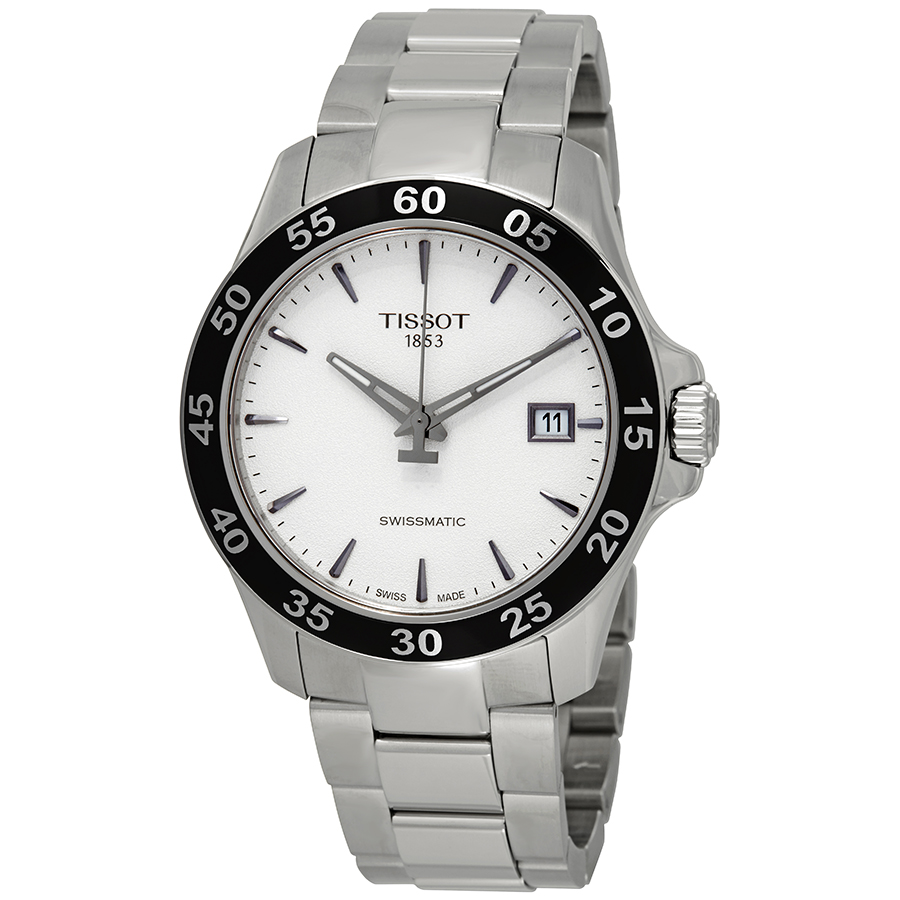 Stainless steel case with a stainless steel bracelet. Stainless steel bezel with a black aluminium top ring. Silver dial with luminous silver-tone hands and index hour markers. Minute markers around the outer rim. Dial Type: Analog. Luminescent hands. Date display at the 3 o'clock position. Automatic movement with a 72-hour power reserve. Scratch resistant sapphire crystal. Transparent case back. Round case shape. Case size: 42.5 mm. Case thickness: 12.7 mm. Band width: 22 mm. Butterfly clasp. Water resistant at 100 meters / 330 feet. Functions: date, hour, minute, second. Casual watch style. Watch label: Swiss Made. Tissot V8 Automatic Silver Dial Mens Watch T1064071103100.