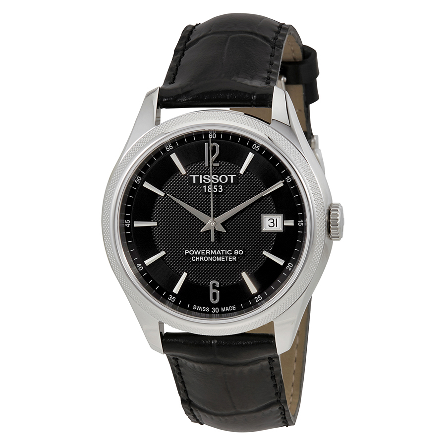Stainless steel case with a black leather strap. Fixed stainless steel bezel. Black dial with silver-tone hands and index hour markers. Arabic numerals mark the 6 and 12 o'clock positions. Minute markers around the outer rim. Dial Type: Analog. Date display at the 3 o'clock position. Powermatic 80.811 automatic movement with an 80-hour power reserve. Scratch resistant sapphire crystal. Transparent case back. Round case shape. Case size: 41 mm. Case thickness: 9.84 mm. Band width: 20 mm. Band length: 7.75 inches. Butterfly clasp. Water resistant at 50 meters / 165 feet. Functions: date, hour, minute, second. Dress watch style. Watch label: Swiss Made. Tissot T-Classic Ballade Automatic Black Dial Mens Watch T108.408.16.057.00.