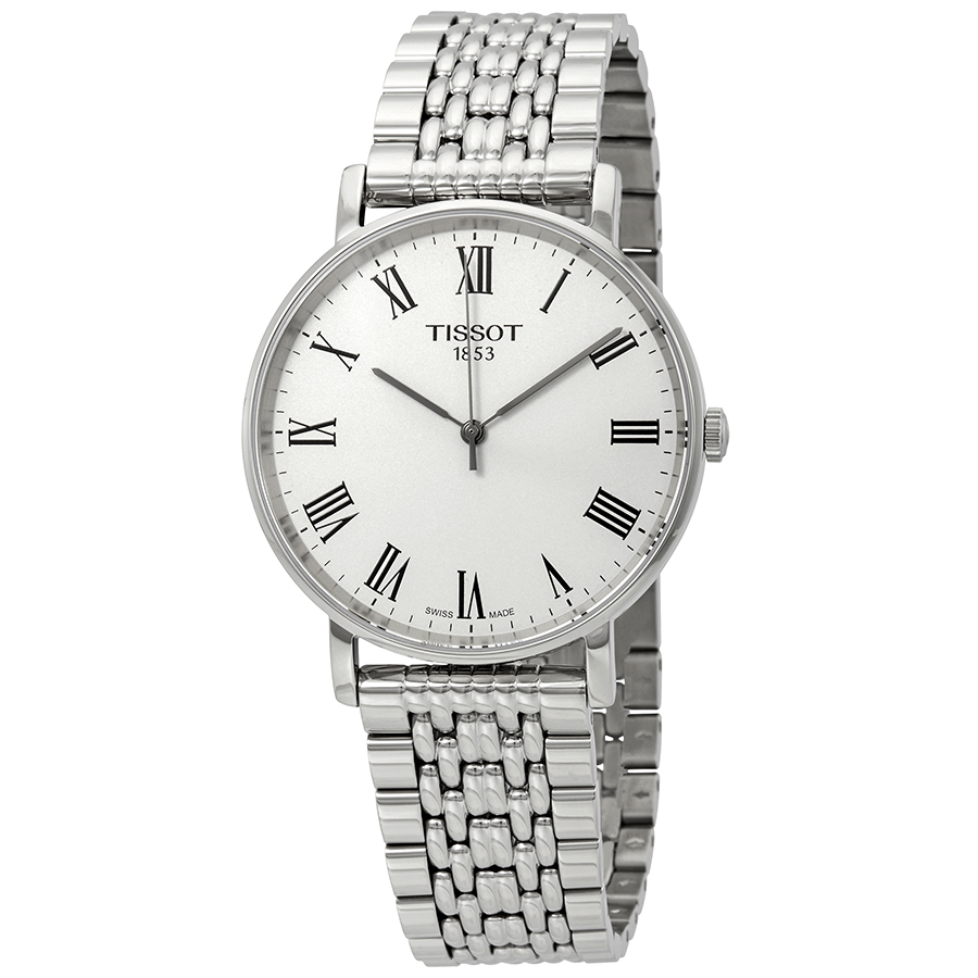Stainless steel case with a stainless steel bracelet. Fixed stainless steel bezel. Silver dial with grey hands and Roman numeral hour markers. Minute markers around the outer rim. Dial Type: Analog. ETA Caliber 902.101 quartz movement. Scratch resistant sapphire crystal. Pull / push crown. Solid case back. Round case shape. Case size: 38 mm. Case thickness: 6.5 mm. Band width: 19 mm. Jewelry clasp. Water resistant at 30 meters / 100 feet. Functions: hour, minute, second. Casual watch style. Watch label: Swiss Made. Tissot Everytime Medium Silver Dial Mens Watch T109.410.11.033.00.