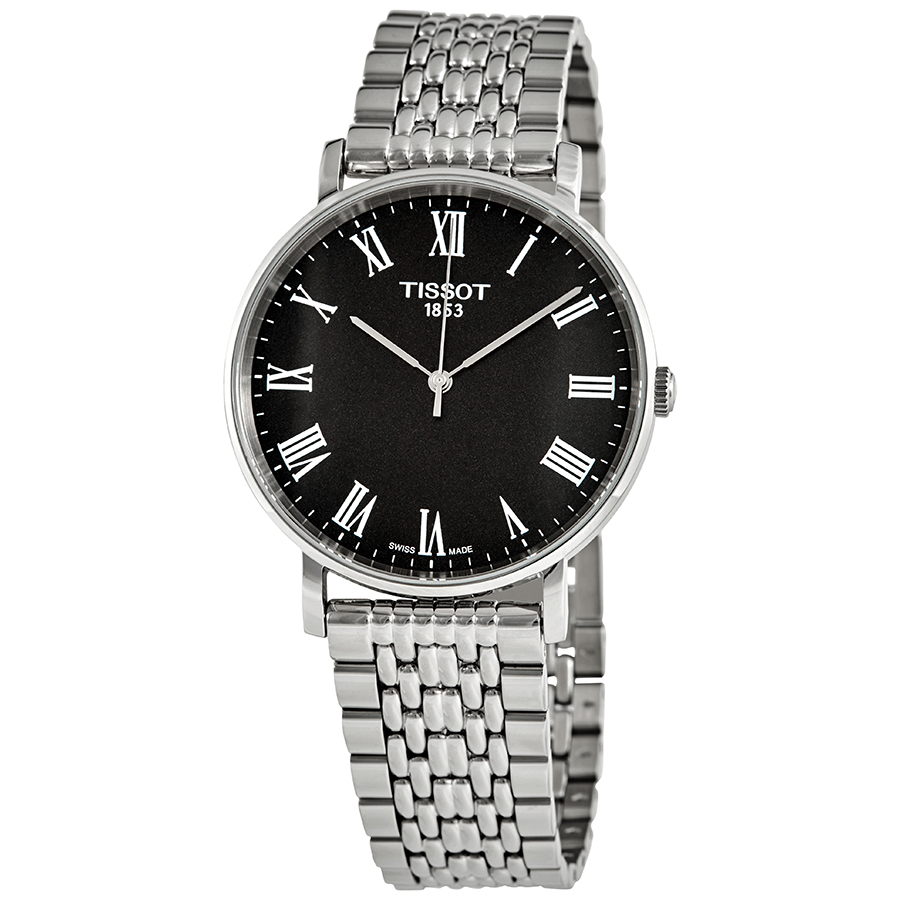 Stainless steel case with a stainless steel bracelet. Fixed stainless steel bezel. Black dial with silver-tone hands and Roman numeral hour markers. Minute markers around the outer rim. Dial Type: Analog. ETA caliber 902.101 quartz movement. Scratch resistant sapphire crystal. Pull / push crown. Solid case back. Round case shape. Case size: 38 mm. Case thickness: 6.5 mm. Band width: 19 mm. Jewelry clasp. Water resistant at 30 meters / 100 feet. Functions: hour, minute, second, battery eol indicator. Casual watch style. Watch label: Swiss Made. Tissot Everytime Medium Black Dial Mens Watch T109.410.11.053.00.