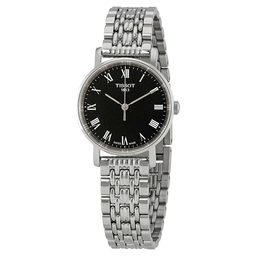 Stainless steel case with a stainless steel bracelet. Fixed stainless steel bezel. Black dial with silver-tone hands and Roman numeral hour markers. Minute markers around the outer rim. Dial Type: Analog. ETA caliber 902.101 quartz movement. Scratch resistant sapphire crystal. Pull / push crown. Solid case back. Round case shape. Case size: 30 mm. Case thickness: 6.2 mm. Band width: 15 mm. Jewelry clasp. Water resistant at 30 meters / 100 feet. Functions: hour, minute, second. Casual watch style. Watch label: Swiss Made. Tissot Everytime Small Black Dial Ladies Watch T1092101105300.