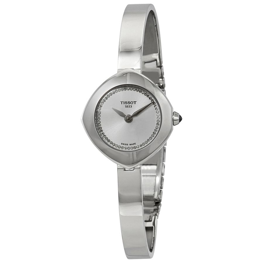 Silver-tone stainless steel case with a silver-tone stainless steel bangle bracelet. Fixed silver-tone stainless steel bezel. Silver (crystal-set) dial with grey hands and crystal hour markers. No markers. Dial Type: Analog. Quartz movement. Scratch resistant sapphire crystal. Pull / push crown. Solid case back. Unique case shape. Fold over with safety release clasp. Water resistant at 30 meters / 100 feet. Functions: hour, minute. Casual watch style. Watch label: Swiss Made. Tissot Silver Dial Stainless Steel Ladies Watch T1131091033600.