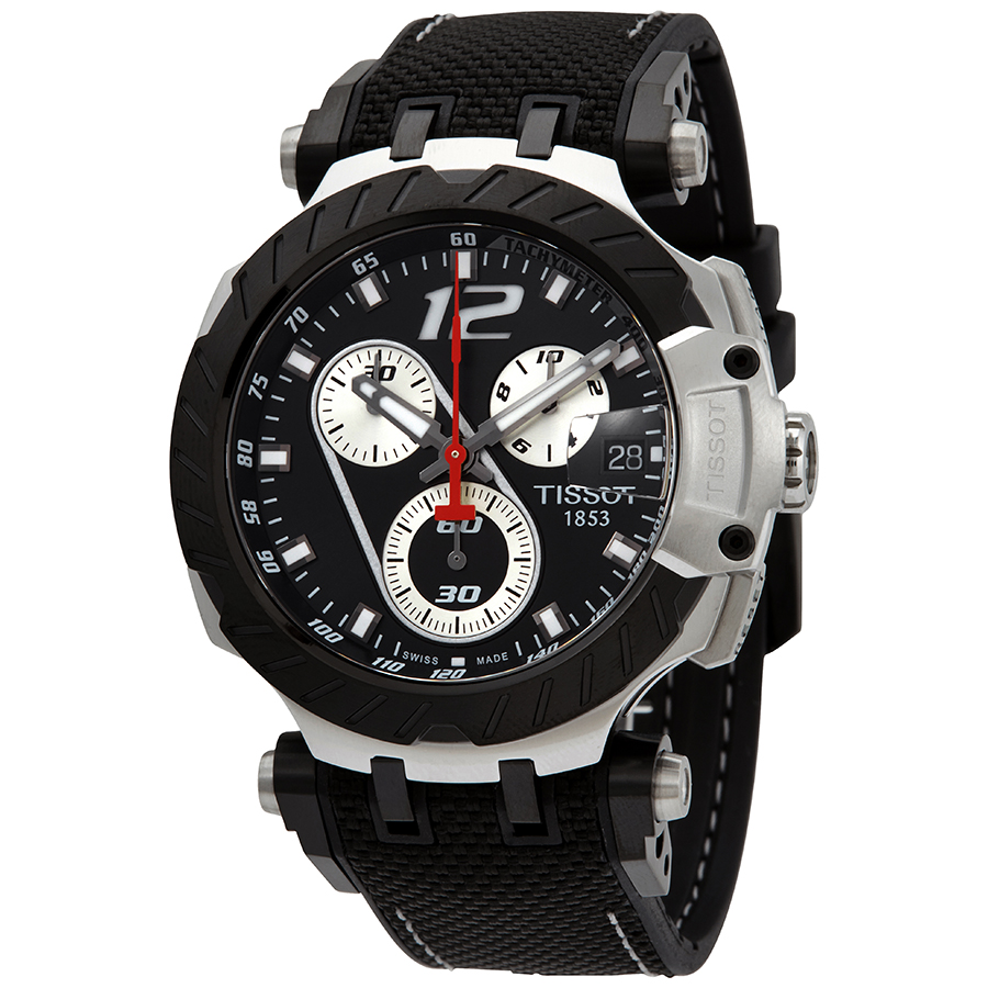 Stainless steel case with a black rubber strap. Fixed black PVD bezel. Black dial with grey skeleton hands and index hour markers. An Arabic numeral appears at the 12 o'clock position. Minute markers. Tachymeter markings around the outer rim. Dial Type: Analog. Luminescent hands and markers. Date display at the 3 o'clock position. Chronograph - three sub-dials displaying: 60 second, 30 minute and 12 hours. ETA caliber G10.212 quartz movement. Scratch resistant sapphire crystal. Solid case back. Round case shape. Case dimensions: 47.6 mm x 43 mm. Case thickness: 12.7 mm. Band width: 22 mm. Tang clasp. Water resistant at 100 meters / 330 feet. Functions: chronograph, rattrapante, date, hour, minute, small second. Sport watch style. Watch label: Swiss Made. Tissot T-Race Jorge Lorenzo Limited Edition Chronograph Quartz Black Dial Mens Watch T115.417.27.057.00.