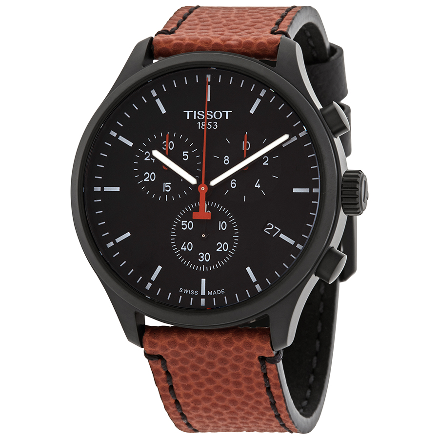 Black PVD stainless steel case with a orange (black backed) leather strap. Fixed black PVD bezel. Black dial with luminous black hands and index hour markers. Minute markers around the outer rim. Dial Type: Analog. Luminescent hands and markers. Date display at the 4 o'clock position. Chronograph - three sub-dials displaying: 60 second, 30 minute and 12 hour. ETA caliber G10.212 quartz movement. Scratch resistant sapphire crystal. Solid case back. Round case shape. Case size: 45 mm. Case thickness: 12.47 mm. Band width: 22 mm. Tang clasp. Water resistant at 100 meters / 330 feet. Functions: chronograph, date, hour, minute, second. Xl Nba Collector Series. Sport watch style. Watch label: Swiss Made. Tissot XL NBA Collector Chronograph Black Dial Mens Watch T116.617.36.051.08.