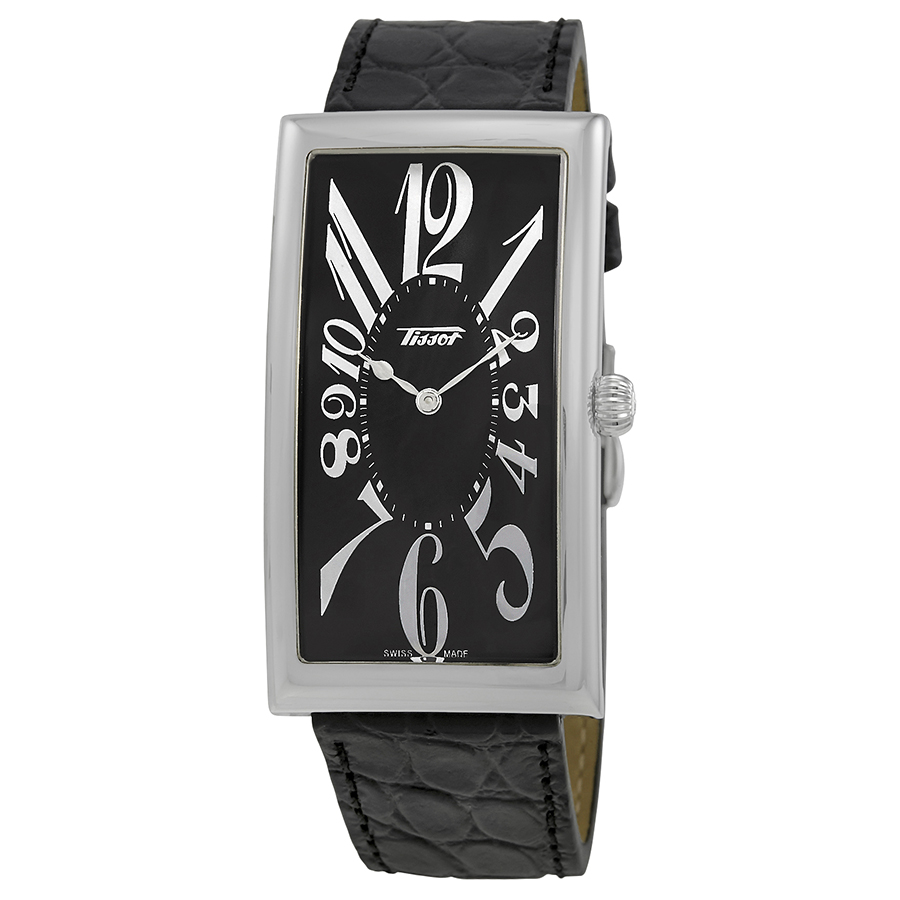 Silver-tone stainless steel case with a black leather strap. Fixed silver-tone stainless steel bezel. Black dial with silver-tone spade-shaped hands and Arabic numeral hour markers. Minute markers around the inner ring. Dial Type: Analog. ETA Caliber 901.001 quartz movement. Scratch resistant mineral crystal. Pull / push crown. Solid case back. Round case shape, case size: 49 mm x 27 mm, case thickness: 7 mm. Band width: 20 mm. Tang clasp. Water resistant at 30 meters / 100 feet. Functions: hour, minute. Dress watch style. Watch label: Swiss Made. Tissot Heritage Black Dial Black Leather Mens Watch T1175091605200.