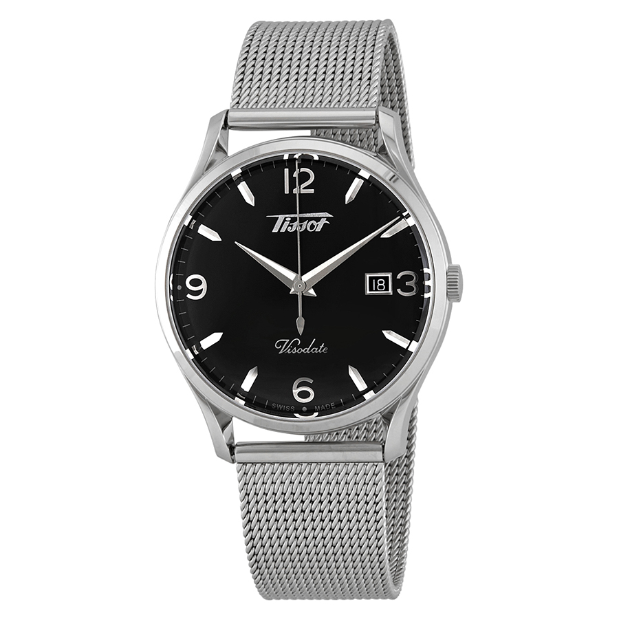 Stainless steel case with a stainless steel mesh bracelet. Fixed stainless steel bezel. Black dial with silver-tone dauphine-style hands and index hour markers. Arabic numerals mark the 3, 6, 9 and 12 o'clock positions. Minute markers around the outer rim. Dial Type: Analog. Date display at the 3 o'clock position. ETA Caliber F06.111 quartz movement. Scratch resistant sapphire crystal. Pull / push crown. Solid case back. Round case shape. Case size: 40 mm. Case thickness: 10.7 mm. Band width: 20 mm. Fold over slip through clasp. Water resistant at 30 meters / 100 feet. Functions: date, hour, minute, second. Heritage Visodate Series. Casual watch style. Watch label: Swiss Made. Tissot Heritage Visodate Black Dial Mens Watch T1184101105700.