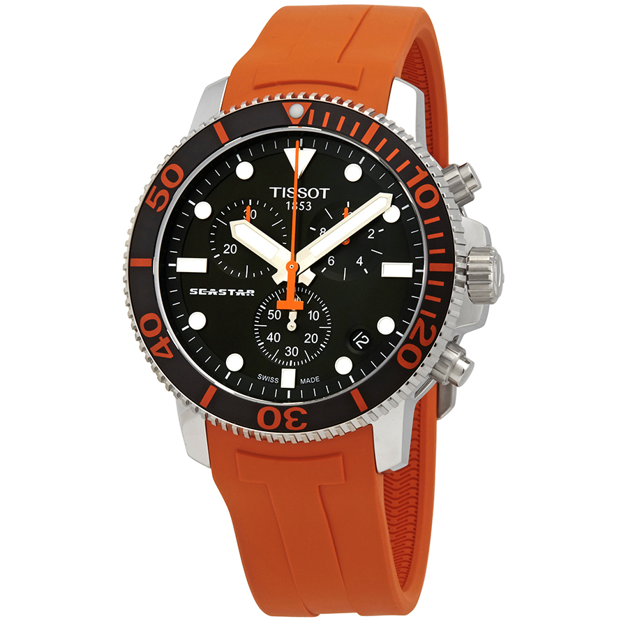 Stainless steel case with a orange rubber strap. Uni-directional rotating stainless steel bezel with a black ceramic ring. Black dial with luminous silver-tone hands and dot hour markers. Minute markers around the outer rim. Dial Type: Analog. Luminescent hands and markers. Date display between the 4 and 5 o'clock positions. Chronograph - three sub-dials displaying: 60 second, 30 minute and 12 hours. ETA G10.212 quartz movement. Scratch resistant sapphire crystal. Screw down crown. Solid case back. Round case shape. Case size: 45.5 mm. Case thickness: 12.8 mm. Band width: 22 mm. Tang clasp. Water resistant at 300 meters / 1000 feet. Functions: chronograph, date, hour, minute, second. Sport watch style. Watch label: Swiss Made. Tissot Seastar 1000 Chronograph Quartz Black Dial Mens Watch T120.417.17.051.01.