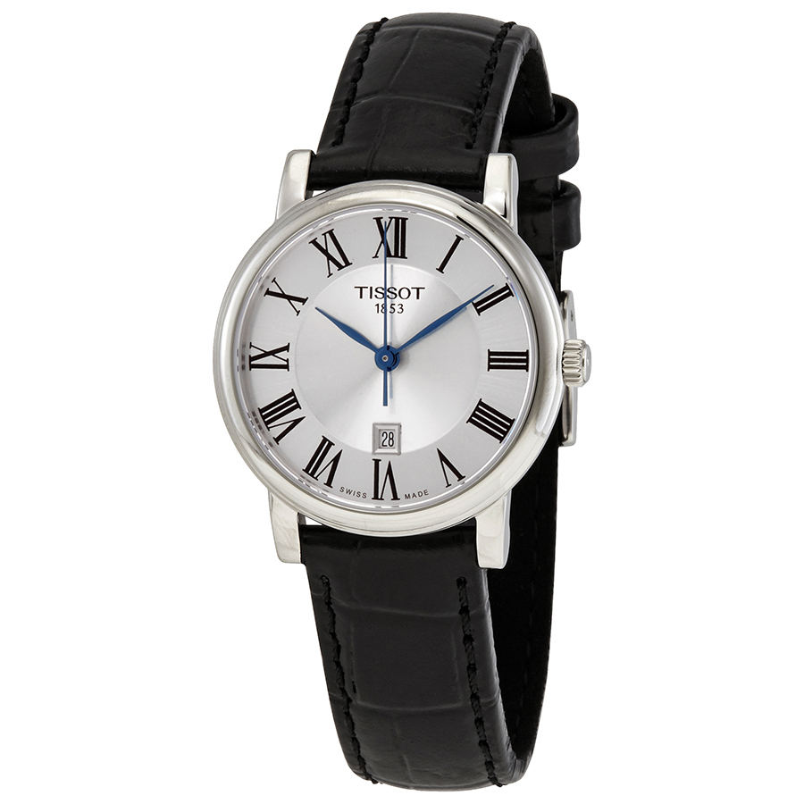 Stainless steel case with a black leather strap. Fixed stainless steel bezel. Silver dial with blue leaf-style hands and Roman numeral hour markers. Dial Type: Analog. Date display above the 6 o'clock position. ETA Caliber F03.115 quartz movement. Scratch resistant sapphire crystal. Pull / push crown. Solid case back. Round case shape. Case size: 30 mm. Case thickness: 6.7 mm. Band width: 15 mm. Butterfly clasp. Water resistant at 50 meters / 165 feet. Functions: date, hour, minute, second. Casual watch style. Watch label: Swiss Made. Tissot Carson Premium Lady Quartz Silver Dial Ladies Watch T122.210.16.033.00.