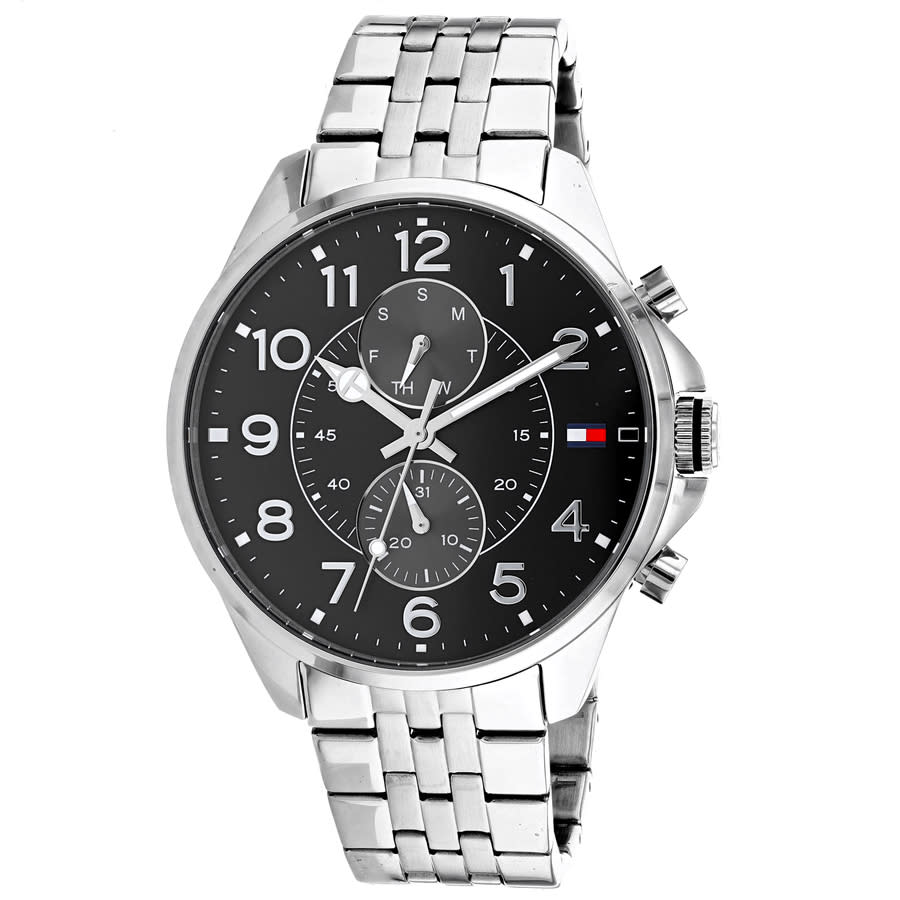 Stainless steel case, Stainless steel bracelet, Black dial, Quartz movement, Scratch resistant mineral, Water resistant up to 5 ATM - 50 meters - 165 feet Silver-tone stainless steel case and bracelet. Fixed silver-tone stainless steel bezel. Black dial with silver-tone hands and index hour markers. Minute markers around the outer rim. Dial Type: Analog. Quartz movement. Scratch resistant mineral crystal. Pull / push crown. Round case shape, case size: 48 mm, case thickness: 10 mm. Band width: 20 mm, band length: 7.5 inches. Fold over clasp. Water resistant at 50 meters / 165 feet. Functions: date, day, hour, minute, second. Classic Series. Fashion watch style. Tommy Hilfiger Classic Quartz Black Dial Mens Watch 1791276.