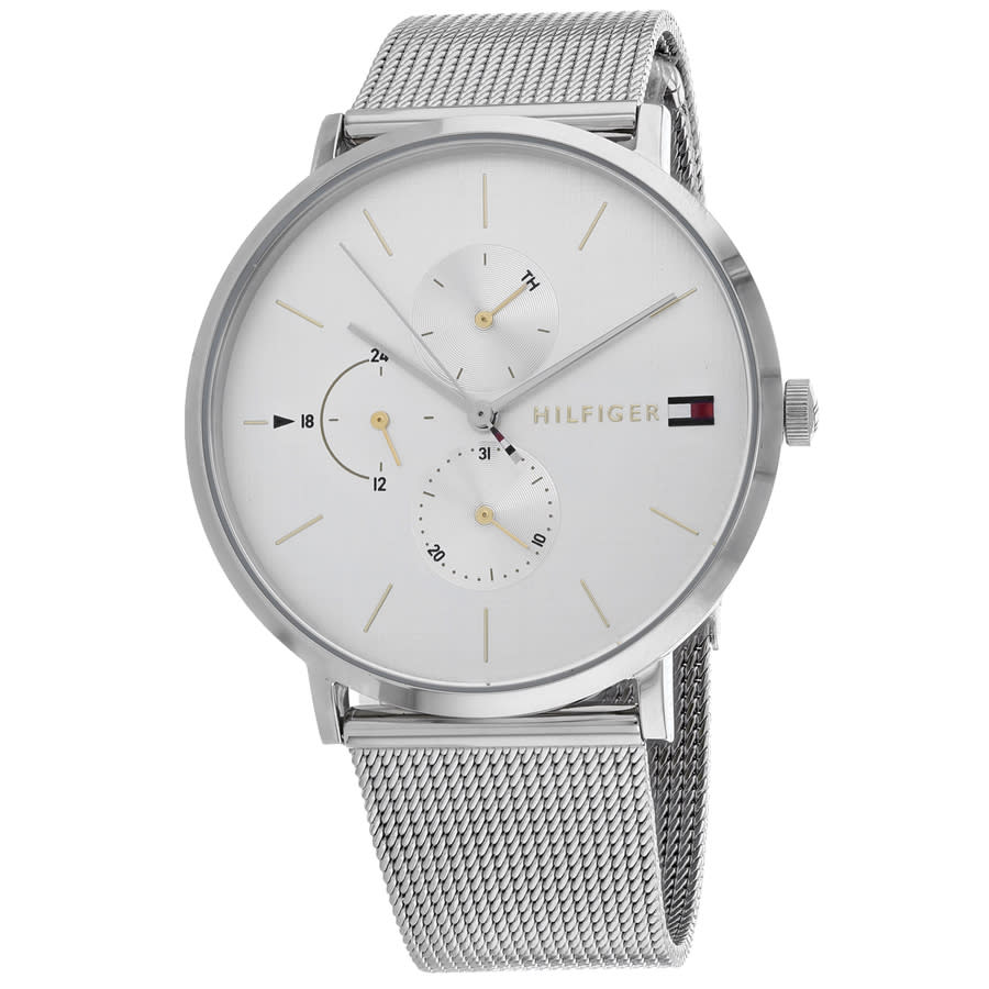 Silver-tone stainless steel case and bracelet. Fixed silver-tone stainless steel bezel. Silver dial with silver-tone hands and index hour markers. Dial Type: Analog. Three sub-dials displaying: date, day and 24 hour. Quartz movement. Scratch resistant mineral crystal. Pull / push crown. Round case shape, case size: 40 mm. Deployment with push button release clasp. Water resistant at 30 meters / 100 feet. Functions: date, day, hour, minute, second. Tommy Hilfiger Jenna Silver Dial Ladies Watch 1781942.