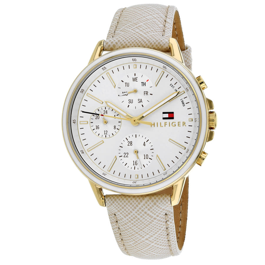 Gold-tone stainless steel case with a beige leather strap. Fixed gold-tone bezel with a white enamel inlay. Champagne dial with luminous gold-tone hands and index hour markers. Minute markers. Arabic numeral minute markers (at 5 minute intervals) around the outer rim. Dial Type: Analog. Luminescent hands and markers. Three multi-function sub-dials displaying: 24 hours, date and day of the week. Quartz movement. Scratch resistant mineral crystal. Pull / push crown. Solid case back. Round case shape. Case size: 40 mm. Case thickness: 10 mm. Band width: 16 mm. Tang clasp. Water resistant at 30 meters / 100 feet. Sport Series. Fashion watch style. Tommy Hilfiger Sport Champagne Dial Mens Watch 1781790.