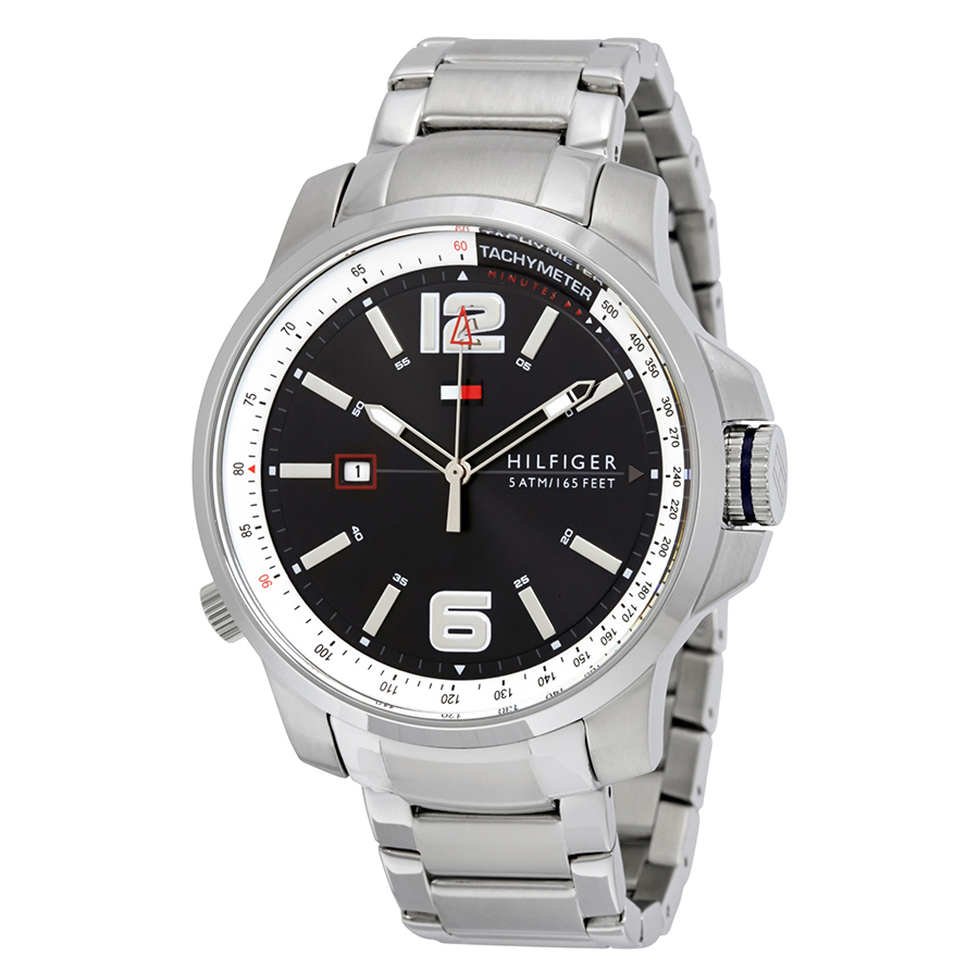 Stainless steel case with a stainless steel bracelet. Fixed stainless steel bezel. Black dial with luminous silver-tone hands and index hour markers. Arabic numerals mark the 6 and 12 o'clock positions. Minute markers. Tachymeter markings around the outer rim. Dial Type: Analog. Luminescent hands and markers. Date display at the 9 o'clock position. Quartz movement. Scratch resistant mineral crystal. Solid case back. Case size: 46 mm. Case thickness: 13 mm. Round case shape. Band width: 21 mm. Deployment clasp. Water resistant at 50 meters / 165 feet. Functions: date, hour, minute, second, tachymeter. Casual watch style. Tommy Hilfiger Black Dial Stainless Steel Mens Watch 1791222.