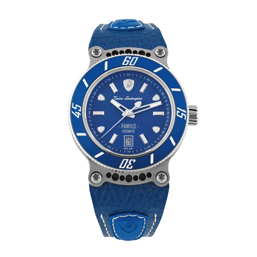 Grey titanium case with a blue leather strap. Fixed blue titanium bezel. Blue dial with silver-tone hands and index hour markers. Minute markers around the outer rim. Dial Type: Analog. Luminescent hands and markers. Date display at the 6 o'clock position. Sellita Caliber SW200-1 Automatic movement, containing 26 Jewels, bitting at 28800 vph, and has a power reserve of approximately 38 hours. Scratch resistant sapphire crystal. Solid case back. Round case shape, case size: 44 mm. Fold over clasp. Water resistant at 100 meters / 330 feet. Functions: date, hour, minute, second. Panfilo Series. Casual watch style. Watch label: Swiss Made. Tonino Lamborghini Panfilo Automatic Blue Dial Mens Watch TLF-T03-2.