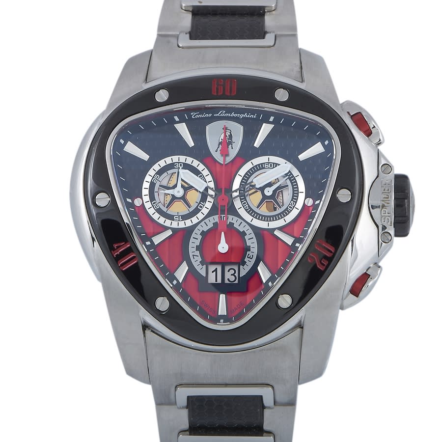 Silver-tone stainless steel case with a two-tone (black and silver-tone) stainless steel bracelet. Fixed black bezel. Multi-color dial with silver-tone hands and index hour markers. Minute markers around the outer rim. Dial Type: Analog. Luminescent hands and markers. Date display at the 6 o'clock position. Chronograph - three sub-dials displaying: 60 second, 30 minute and 12 hour. Ronda Caliber RL 5050.B quartz movement. Scratch resistant sapphire crystal. Solid case back. Unique case shape, case size: 44.3 x 53.5 mm. Butterfly clasp. Functions: chronograph, big date, hour, minute, small second. Spyder Series. Luxury watch style. Watch label: Swiss Movt. Tonino Lamborghini Spyder Chronograph Quartz Mens Watch SW1115.