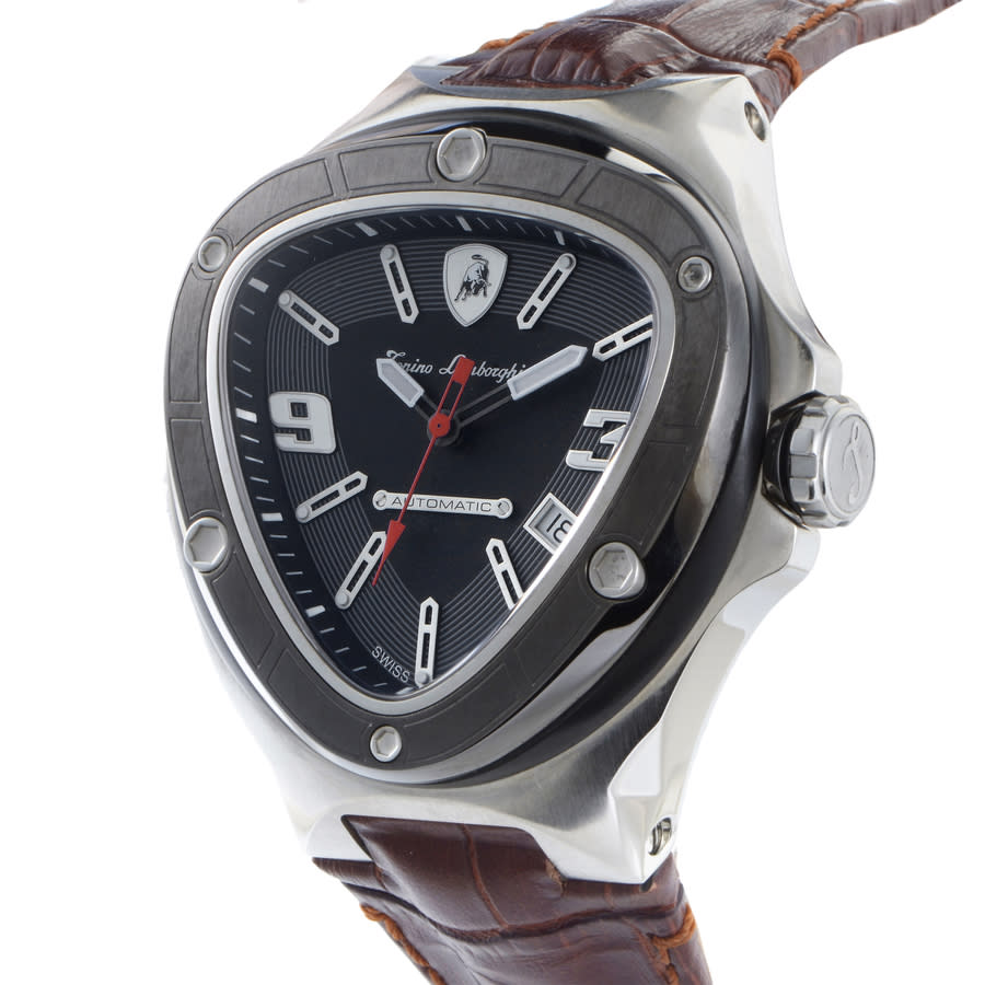 Silver-tone stainless steel case with a brown leather strap. Fixed black PVD bezel. Black dial with luminous silver-tone hands and index hour markers. Arabic numerals appear at the 3 and 9 o'clock positions. Minute markers around the outer rim. Dial Type: Analog. Luminescent hands and markers. Date display at the 4 o'clock position. Automatic movement. Scratch resistant sapphire crystal. Transparent case back. Unique case shape. Case size: 53.1 mm. Deployment clasp with a push button release. Water resistant at 100 meters / 330 feet. Functions: date, hour, minute, second. Spyder Series. Luxury watch style. Watch label: Swiss Made. Tonino Lamborghini Spyder Automatic Black Dial Mens Watch 8856.