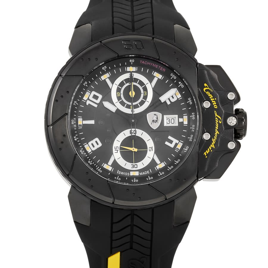 Black-plated stainless steel case with a black (yellow stripe) rubber strap. Black-plated bezel. Black dial with luminous black hands and Arabic numeral and index hour markers. Minute markers. Tachymeter markings around the outer rim. Dial Type: Analog. Luminescent hands and markers. Date display at the 3 o'clock position. Chronograph - two sub-dials displaying: 60 second and 30 minute / 12 hour. Quartz movement. Scratch resistant mineral crystal. Solid case back. Round case shape. Case dimensions: 47 mm x 54 mm. Deployment clasp. Water resistant at 100 meters / 330 feet. Functions: chronograph, tachymeter, date, hour, minute, second. Brake 8 Series. Luxury watch style. Tonino Lamborghini Brake 8 Chronograph Quartz Mens Watch Brake-8.