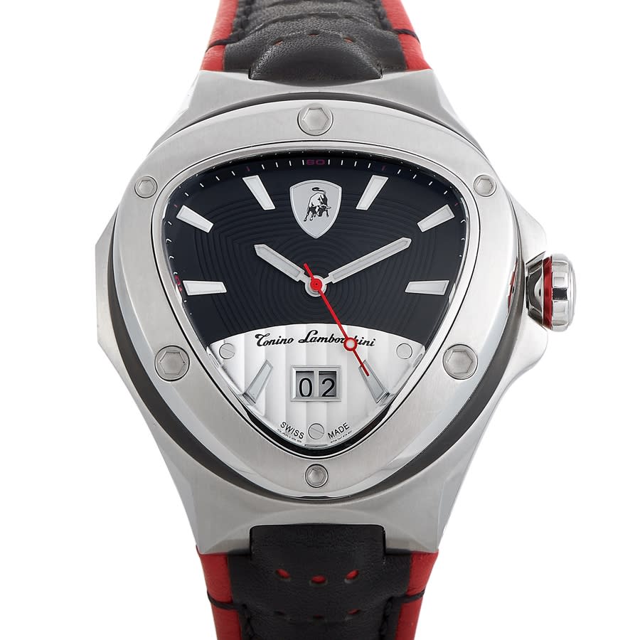 Stainless steel case with a red and black leather strap. Fixed stainless steel bezel with a black aluminium ring. Black and silver dial with luminous silver-tone hands and index hour markers. Minute markers around the outer rim. Dial Type: Analog. Luminescent hands and markers. Date display above the 6 o'clock position. Quartz movement. Scratch resistant sapphire crystal. Solid case back. Triangle case shape. Case size: 53.5 mm. Fold over clasp. Water resistant at 100 meters / 330 feet. Functions: date, hour, minute, second. Spyder Series. Luxury watch style. Watch label: Swiss Made. Tonino Lamborghini Spyder Quartz Black and Silver Dial Mens Watch SW3024.