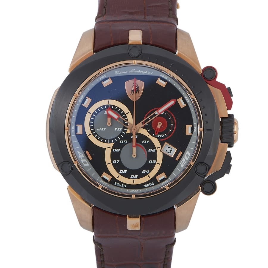 Gold PVD stainless steel case with a brown leather strap. Fixed black PVD bezel. Black dial with luminous rose gold-tone hands and index hour markers. Arabic numeral minute markers (at 5 minute intervals). Minute markers around the outer rim. Dial Type: Analog. Luminescent hands and markers. Date display at the 4 o'clock position. Chronograph - three sub-dials displaying: 60 second, 30 minute and 1/10th of a second. Caliber RL 5040.D quartz movement. Scratch resistant mineral crystal. Solid case back. Round case shape. Case size: 45 mm. Deployment clasp. Water resistant at 100 meters / 330 feet. Functions: chronograph, date, hour, minute, second. Shield Series Series. Luxury watch style. Watch label: Swiss Made. Tonino Lamborghini Shield Series Chronograph Quartz Black Dial Mens Watch SW7802.