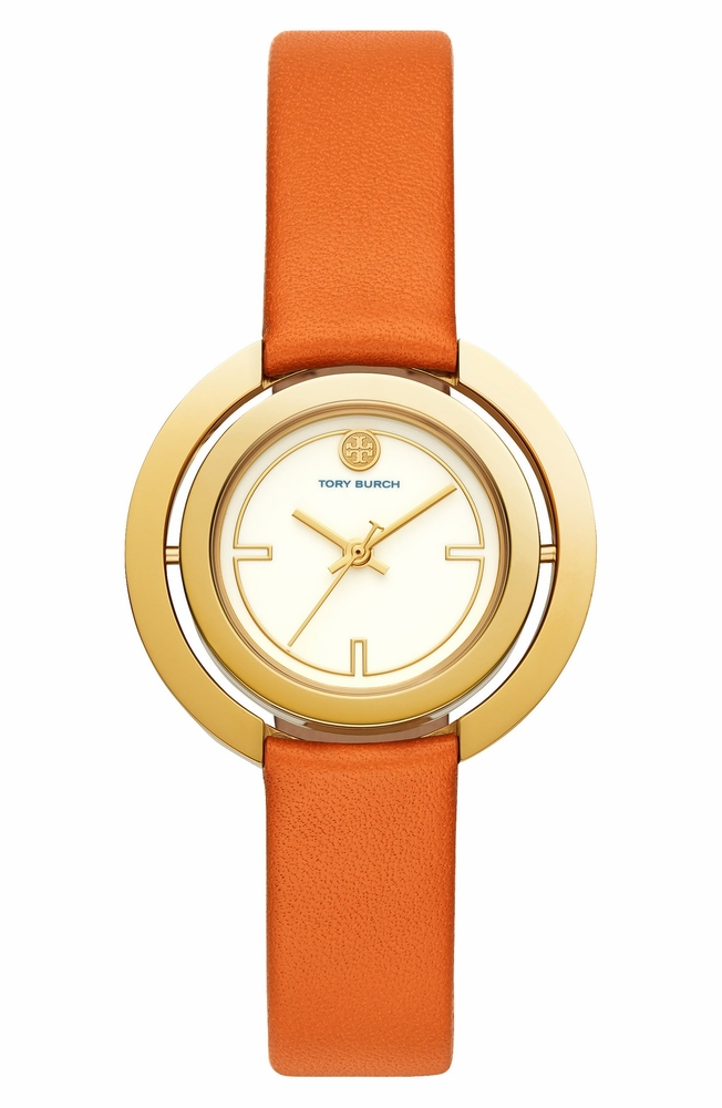 Yellow gold-tone stainless steel case with a orange leather strap. Fixed double yellow gold-tone bezel. White dial with yellow gold-tone hands. Index markers at the 3, 6 and 9 o'clock positions. The Double-T logo appears at the 12 o'clock position. Dial Type: Analog. Quartz movement. Scratch resistant mineral crystal. Solid case back. Round case shape. Case size: 34 mm. Case thickness: 5 mm. Band width: 14 mm. Tang clasp. Water resistant at 30 meters / 100 feet. Functions: hour, minute, second. Additional Info: battery type: sr621sw. Dress watch style. Tory Burch Grier Quartz White Dial Orange Leather Ladies Watch TBW5305.