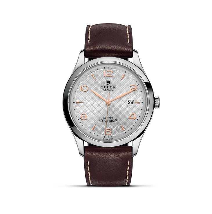 Stainless steel case with a brown leather strap. Fixed stainless steel bezel. Silver dial with rose gold-tone hands and alternating Arabic numeral and index hour markers. Minute markers around the outer rim. Dial Type: Analog. Date display at the 3 o'clock position. Tudor calibre T601 automatic movement, based upon ETA 2824, containing 25 Jewels, bitting at 28800 vph, and has a power reserve of approximately 38 hours. Scratch resistant sapphire crystal. Screw down crown. Solid case back. Round case shape. Case size: 41 mm. Fold over clasp. Water resistant at 100 meters / 330 feet. Functions: date, hour, minute, second. 1926 Series. Luxury watch style. Watch label: Swiss Made. Tudor 1926 Automatic Silver Dial Mens Watch 91650-0006.