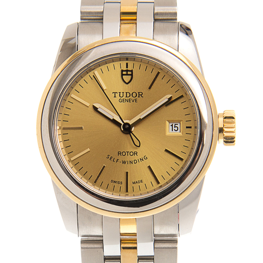 Silver-tone 18kt gold case with a two-tone 18kt gold & stainless steel bracelet. Fixed gold-tone & silver-tone bezel. Gold tone dial with gold-tone hands and index hour markers. Minute markers around the outer rim. Dial Type: Analog. Luminescent hands. Date display at the 3 o'clock position. Automatic movement. Scratch resistant sapphire crystal. Solid case back. Round case shape. Case size: 26 mm. Deployment with push button release clasp. Functions: date, hour, minute, second. Additional Info: original box, international warranty card, manual (complete accessories). Luxury watch style. Watch label: Swiss Made. Tudor Glamour Date Automatic Watch 51003-68013-CH.