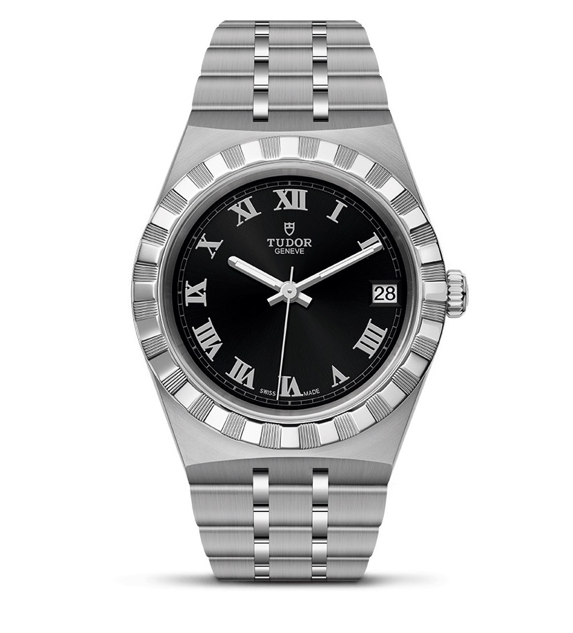 316L steel case with a 316L steel bracelet. Fixed 316L steel bezel. Black dial with luminous silver-tone hands and Roman numeral hour markers. Minute markers around the outer rim. Dial Type: Analog. Luminescent hands. Date display at the 3 o'clock position. Tudor calibre T601 automatic movement, based upon ETA 2824, containing 25 Jewels, bitting at 28800 vph, and has a power reserve of approximately 38 hours. Scratch resistant sapphire crystal. Screw down crown. Solid case back. Round case shape. Case size: 34 mm. Fold over clasp with a safety release. Water resistant at 100 meters / 330 feet. Functions: date, hour, minute, second. Royal Series. Luxury watch style. Watch label: Swiss Made. Tudor Royal Automatic Black Dial Ladies Watch M28400-0003.
