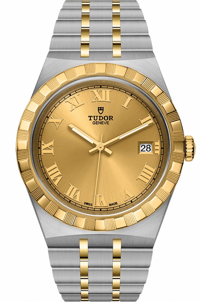 Silver-tone stainless steel case with a silver-tone stainless steel with 18kt yellow gold links bracelet. Fixed 18kt yellow gold bezel. Champagne dial with luminous yellow gold hands and Roman numeral hour markers. Minute markers around the outer rim. Dial Type: Analog. Date display at the 3 o'clock position. Tudor Calibre T601 Automatic movement, based upon ETA 2824, containing 25 Jewels, bitting at 28800 vph, and has a power reserve of approximately 38 hours. Scratch resistant sapphire crystal. Screw down crown. Solid case back. Round case shape, case size: 38 mm. Fold over clasp. Water resistant at 100 meters / 330 feet. Functions: date, hour, minute, second. Royal Series. Luxury watch style. Watch label: Swiss Made. Tudor Royal Automatic Champagne Dial 38 mm Watch M28503-0003.