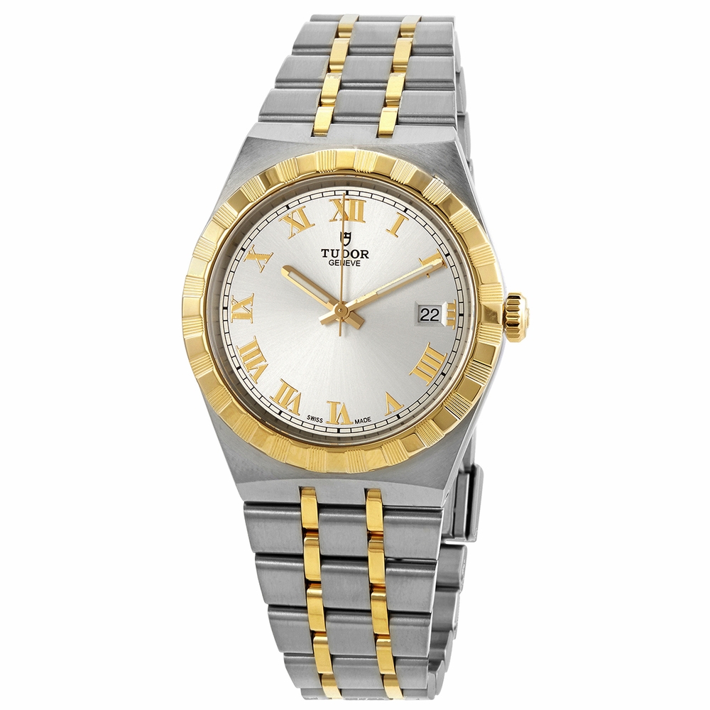 Stainless steel case with a stainless steel bracelet with 18k yellow gold links. Fixed 18k yellow gold bezel. Silver dial with luminous yellow gold-tone hands and Roman numeral hour markers. Minute markers around the outer rim. Dial Type: Analog. Luminescent hands. Date display at the 3 o'clock position. Caliber T601 automatic movement. Scratch resistant sapphire crystal. Screw down crown. Solid case back. Round case shape. Case size: 38 mm. Fold over clasp. Water resistant at 100 meters / 330 feet. Functions: date, hour, minute, second. Royal Series. Luxury watch style. Watch label: Swiss Made. Tudor Royal Automatic Silver Dial 38 mm Watch M28503-0001.