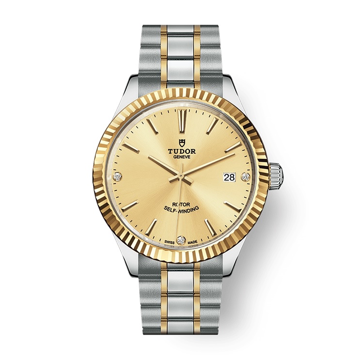 Stainless steel case with a stainless steel bracelet with yellow gold links. Fixed fluted yellow gold bezel. Champagne dial with yellow gold hands and index hour markers. Diamond markers at the 3, 6 and 9 o'clock positions. Minute markers around the outer rim. Dial Type: Analog. Date display at the 3 o'clock position. Tudor calibre T601 automatic movement, based upon ETA 2824, containing 25 Jewels, bitting at 28800 vph, and has a power reserve of approximately 38 hours. Scratch resistant sapphire crystal. Screw down crown. Solid case back. Round case shape. Case size: 38 mm. Fold over clasp with a safety release. Water resistant at 100 meters / 330 feet. Functions: date, hour, minute, second. Style Series. Luxury watch style. Watch label: Swiss Made. Tudor Style Automatic Diamond Champagne Dial Unisex Watch M12513-0007.