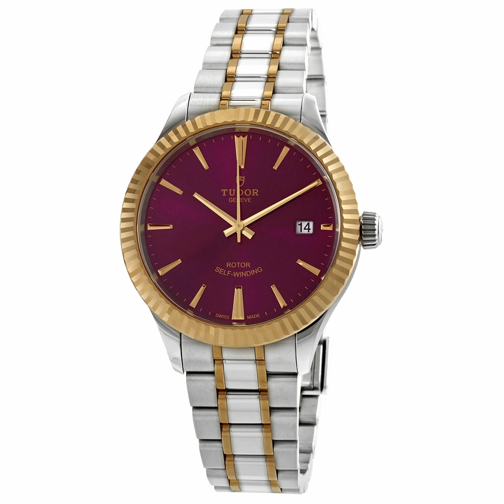 Stainless steel case with a stainless steel bracelet with yellow gold accents. Fixed fluted yellow gold bezel. Burgundy dial with yellow gold-tone hands and index hour markers. Minute markers around the outer rim. Dial Type: Analog. Date display at the 3 o'clock position. Tudor Calibre 2824 Automatic movement, based upon ETA 2824, containing 25 Jewels, bitting at 28800 vph, and has a power reserve of approximately 38 hours. Scratch resistant sapphire crystal. Screw down crown. Solid case back. Round case shape. Case size: 38 mm. Fold over clasp. Water resistant at 100 meters / 330 feet. Functions: date, hour, minute, second. Style Series. Luxury watch style. Watch label: Swiss Made. Tudor Style Automatic Burgundy Dial Watch M12513-0013.