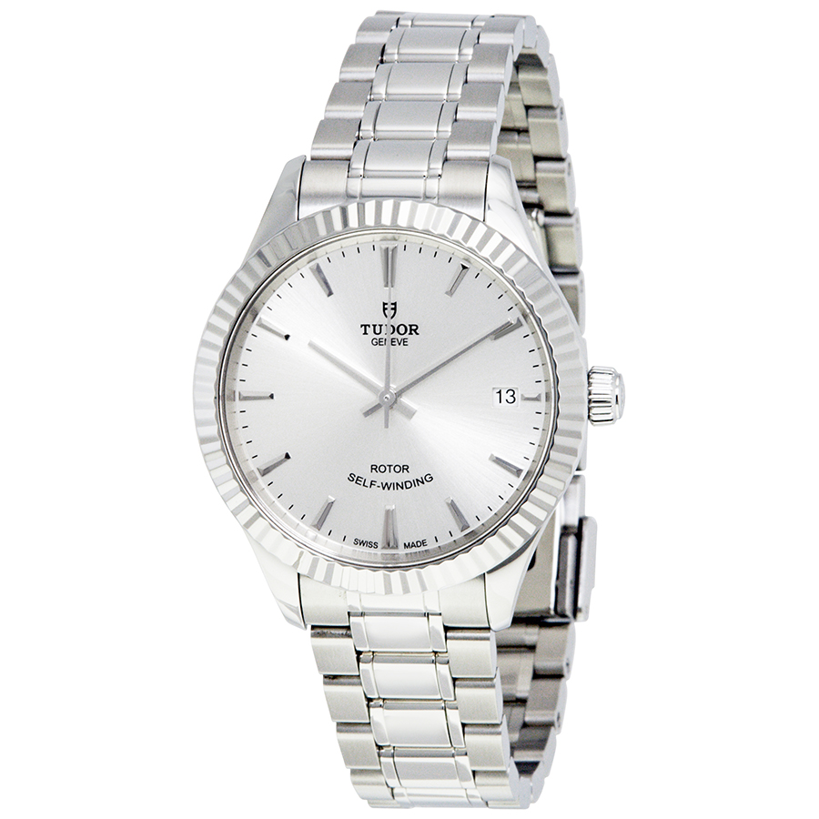 Stainless steel case with a stainless steel bracelet. Fixed fluted stainless steel bezel. Silver dial with silver-tone hands and index hour markers. Minute markers around the outer rim. Dial Type: Analog. Date display at the 3 o'clock position. Tudor calibre 2824 automatic movement with a 38-hour power reserve. Scratch resistant sapphire crystal. Screw down crown. Solid case back. Case size: 34 mm. Round case shape. Fold over clasp. Water resistant at 100 meters / 330 feet. Functions: date, hour, minute, second. Luxury watch style. Watch label: Swiss Made. Tudor Style Automatic Silver Dial Ladies Watch M12310-0001.