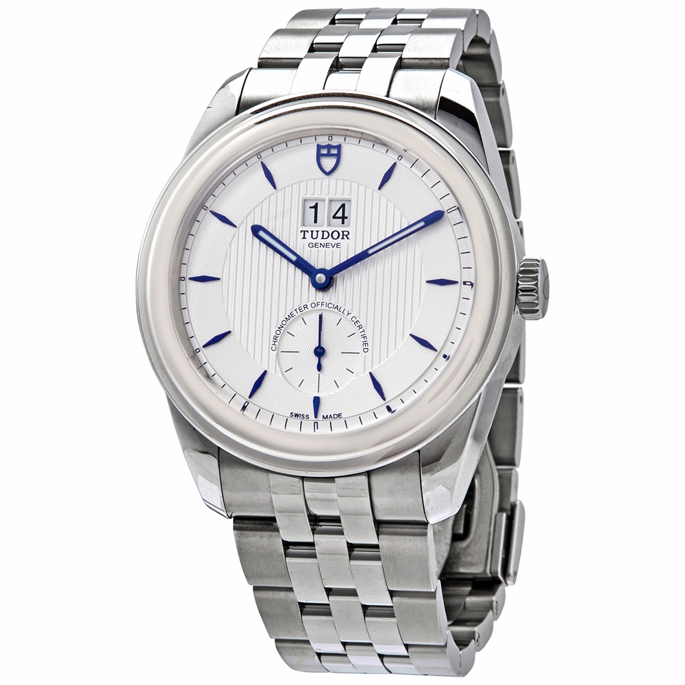 Stainless steel case with a stainless steel bracelet. Fixed stainless steel bezel. Silver dial with luminous blue hands and index hour markers. Minute markers around the outer rim. Dial Type: Analog. Luminescent hands and markers. Double date display below the 12 o'clock position. Small seconds sub-dial. Tudor calibre MT5641 automatic movement, containing 32 Jewels, bitting at 28800 vph, and has a power reserve of approximately 70 hours. Scratch resistant sapphire crystal. Screw down crown. Transparent case back. Round case shape. Case size: 42 mm. Band width: 22 mm. Fold over clasp with a safety release. Water resistant at 100 meters / 330 feet. Functions: big date, hour, minute, small second, chronometer. Glamour Double Date Series. Luxury watch style. Watch label: Swiss Made. Tudor Glamour Double Date Automatic Silver Dial Mens Watch M57100-0001.