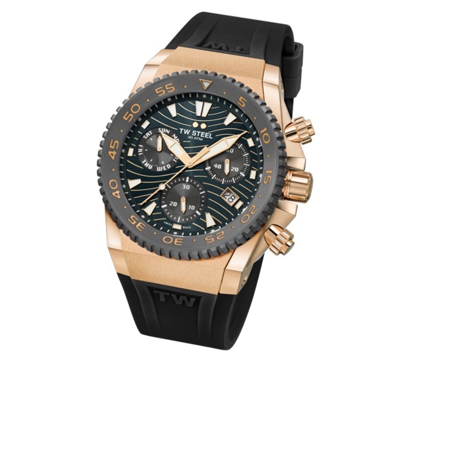 Rose gold-tone stainless steel case with a black rubber strap. Black stainless steel bezel. Black dial with rose gold-tone hands and index hour markers. Minute markers around the outer rim. Dial Type: Analog. Luminescent hands and markers. Date display at the 4 o'clock position. Three sub-dials displaying: day, 60 second and 30 minute. Ronda Caliber Z60 quartz movement. Scratch resistant sapphire crystal. Solid case back. Round case shape, case size: 44 mm. Buckle clasp. Water resistant at 300 meters / 1000 feet. Functions: chronograph, date, day, hour, minute, small second. Ace Diver Series. Dive watch style. Watch label: Swiss Movt. TW Steel Ace Diver Chronograph Quartz Black Dial Mens Watch ACE412.